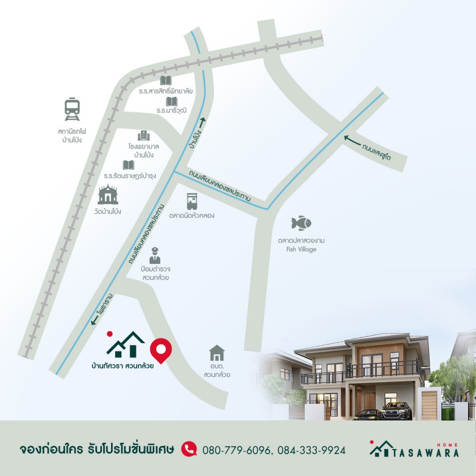 เปิดจองแล้ว บ้านเดี่ยวชั้นเดียว และบ้านเดี่ยวสองชั้น ทำเลที่ตั้ง : สวนกล้วย(ซอยอบต.สวนกล้วย บ้านโป่ง)