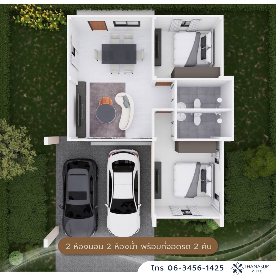 โดยรูปแบบเป็น บ้านเดี่ยวชั้นเดียว มีจำนวน 2 ห้องนอน 2 ห้องน้ำ 1 ห้องรับแขก 1 ห้องครัว