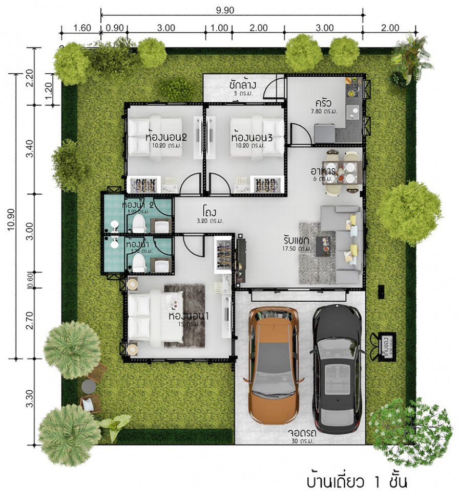 • ห้องนอน (เริ่มต้น): 3 ห้อง