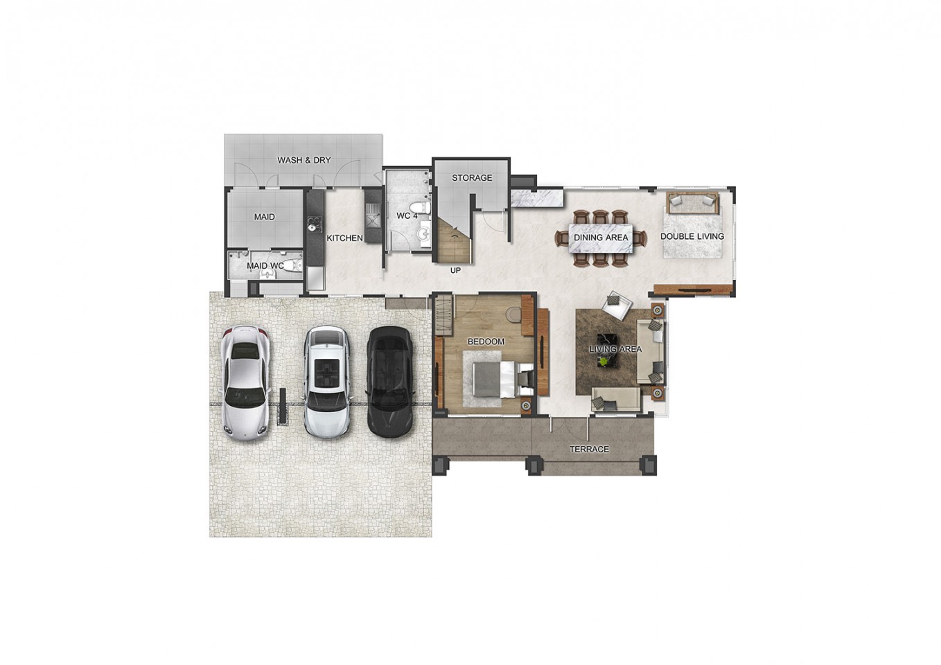 4 ห้องนอน, 4 ห้องน้ำ, Double living, Family Area, ห้องครัว, ห้องแม่บ้าน (ห้องนอนล่างพื้น Absorption Floor ลดแรงกระแทก และรองรับการใช้งานด้วยรถเข็น สำหรับผู้สูงอายุ) พื้นชั้นบนไม้สัก, 3 จอดรถ