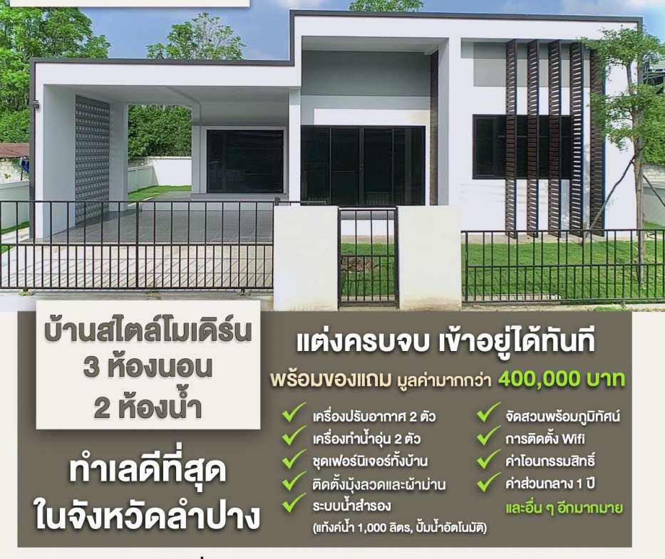 บ้านชั้นเดียว 3 ห้องนอน 2 ห้องน้ำ 2 ที่จอดรถ