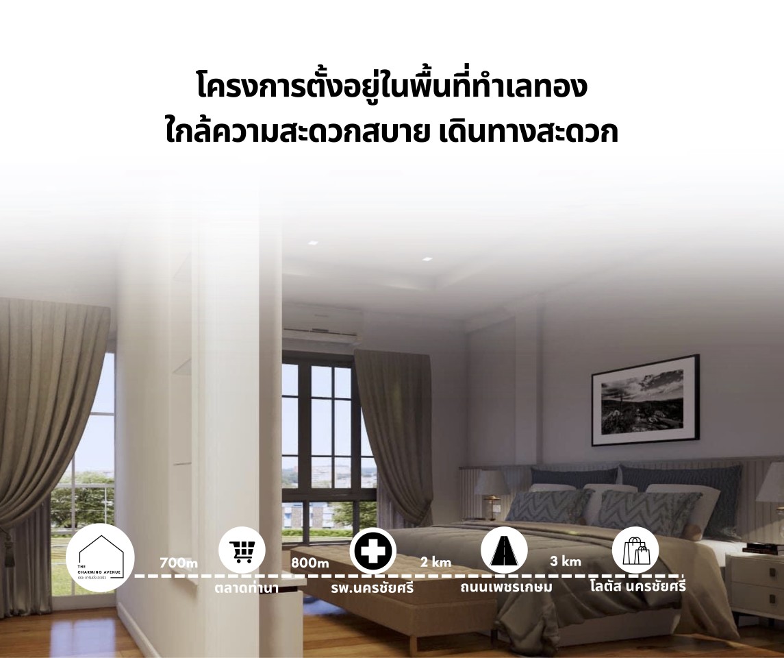 โครงการ The Charming Avenue นครชัยศรี เป็นโครงการหมู่บ้านใหม่ อยู่ในทำเลศักยภาพ ใจกลางตัวเมืองนครชัยศรี ใกล้สถานที่ราชการ ศูนย์การค้า โรงพยาบาล เดินทางสะดวกเป็นทางเชื่อมต่อไปยังถนนเพชรเกษม ภายในโครงการประกอบไปด้วยบ้านเดี่ยวและบ้านทาวน์โฮมสไตล์โมเดิร์นร่วมสมัยที่มากับพื้นที่ใช้สอยถึง 128 ตารางเมตร เอกสิทธิ์เพียง 71 ครอบครัวเท่านั้น การออกแบบทั้งภายนอกและภายในของตัวบ้านคำนึงถึงการใช้งานของผู้อยู่อาศัยเป็นหลัก ไม่ว่าจะเป็นการออกแบบให้หน้าบ้านมีพื้นที่กว้างจอดรถได้ถึง 2 คันและพื้นที่ด้านหลังบ้านที่ผู้อยู่อาศัยสามารถดัดแปลงการใช้งานให้ได้ตรงความต้องการ นอกจากนี้โครงการ The Charming Avenue ยังมีพื้นที่สีเขียวมากกว่า 100 ตารางวาเพื่อคืนความสดชื่นและร่มรื่นให้กับลูกบ้าน