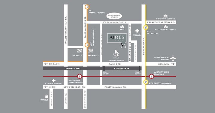 Aires Rama 9 ตั้งอยู่ท่ามกลางย่านที่พักอาศับที่ เงียบสงบร่มรื่น รายล้อมด้วยความสมบูร์ณแบบของร้านอาหาร ศูนย์การค้า และคอมมูนิตี้ มอลล์ การเดินทางสะดวกสบายเชื่อมต่อชีวิตเมืองด้วยคมนาคมหลายเส้นทาง เช่น ทางด่วน Airport Link และ รถไฟฟ้า