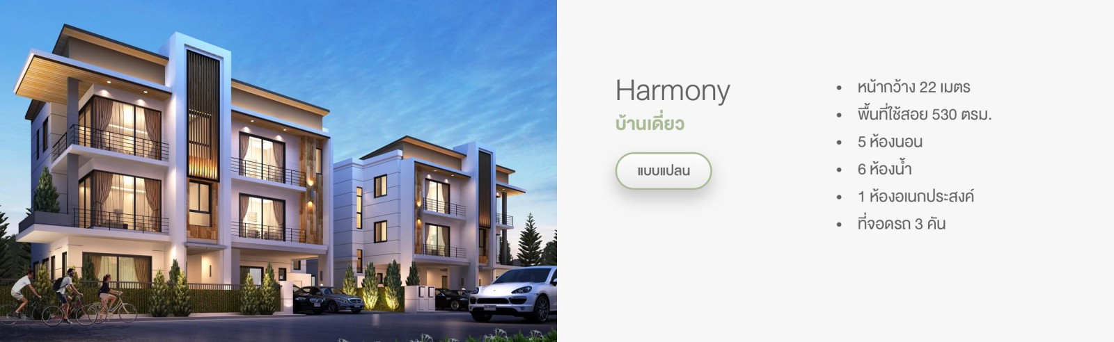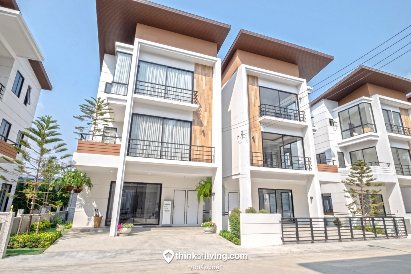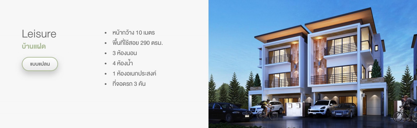บ้านแฝด 3 ชั้น สไตล์ Modern ขนาดหน้ากว้างที่ดินเริ่มต้นที่ 10 เมตร พื้นที่ใช้สอย 250-290 ตารางเมตร ให้ความรู้สึกส่วนตัวแบบบ้านเดี่ยว ด้วยดีไซน์ และฟังก์ชันเชื่อมต่อผนังเพียงส่วนห้องน้ำชั้นหนึ่ง