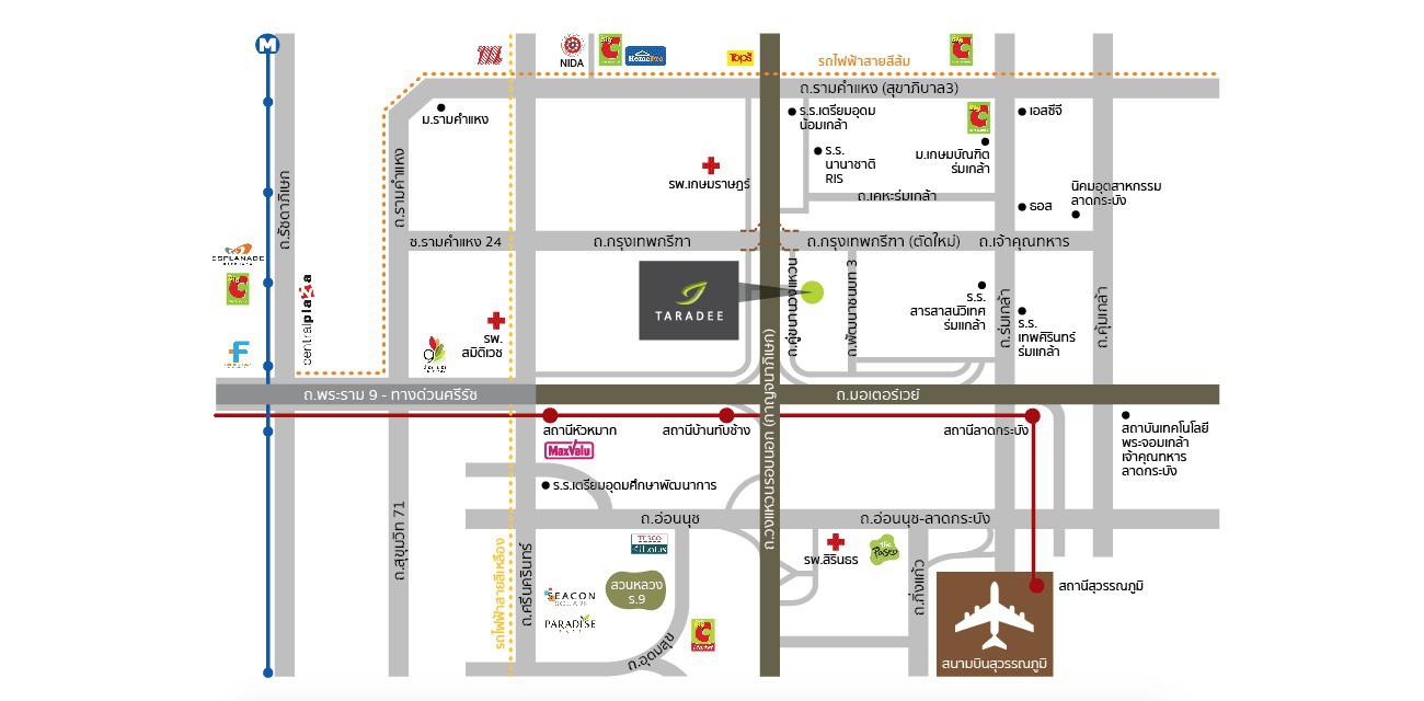 TARADEE วงแหวน – พระราม 9 ติดถนนใหญ่ เชื่อมต่อถนนมอเตอร์เวย์ และถนนกรุงเทพกรีฑาตัดใหม่ ใกล้ทางขึ้น/ลงทางด่วนบางนา-ชลบุรี และสนามบินสุวรรณภูมิ เดินทางสู่ถนนพระราม 9 – ศรีนครินทร์ – รามคำแหง ได้สะดวก รวดเร็ว